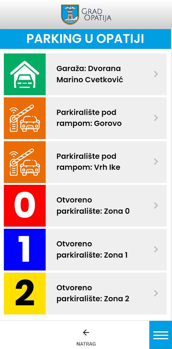 Popis parkirnih zona na području Grada Opatije, s pregledom zona na karti te cijenama i razdobljima naplate za pojedina parkirališta. Za otvorena parkirališta moguće je plaćanje parkinga SMS-om direktno iz aplikacije.