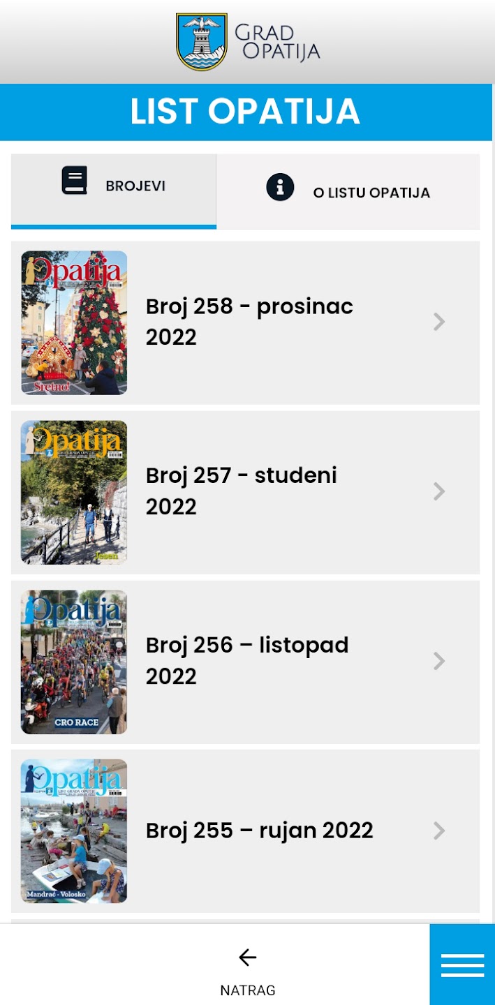 Pregled Lista Opatija na mobilnim uređajima omogućuje dostupnost novosti još većem broju korisnika, a uz to korisnici aplikacije dobivaju notifikaciju po objavi novog broja u trenutku kada je List objavljen na Internetskim stranicama Grada.